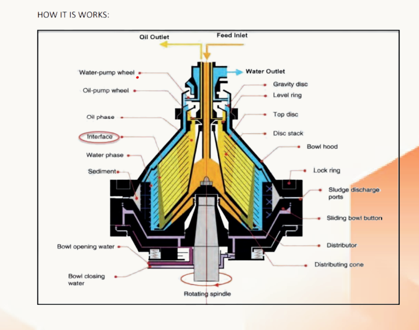 Advanced Self-Cleaning Mechanism (SELF): While the separator is in operation, the bowl’s sliding mechanism opens through a hydraulic system, allowing the accumulated fine solids to be discharged through solid ports in the bowl. This self-cleaning feature reduces downtime and enhances the overall efficiency of the separation process.
